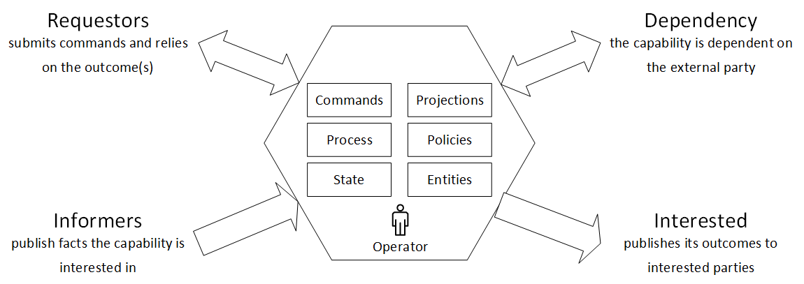 The capability boundary has no preferred direction — commands can come from anywhere, events can flow in any direction, dependencies can point anywhere in the system. What matters is not the topology but the nature of each relationship.
